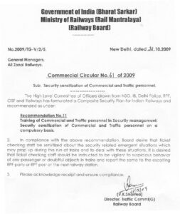 Security sensitization of Commercial and Traffic personnel CC-61 of 2009 dt. 22.10.2009 indianrailwayrules.com